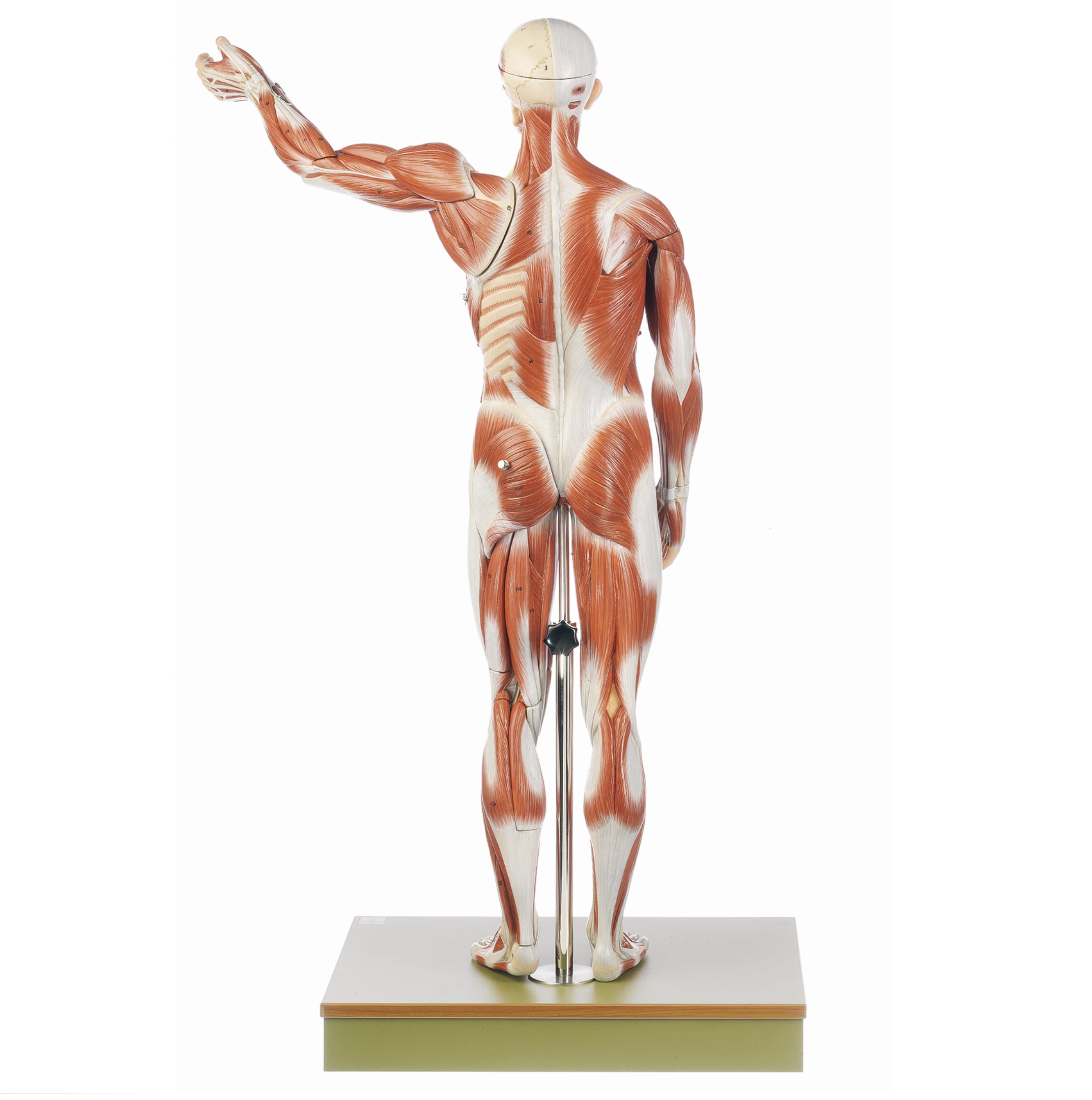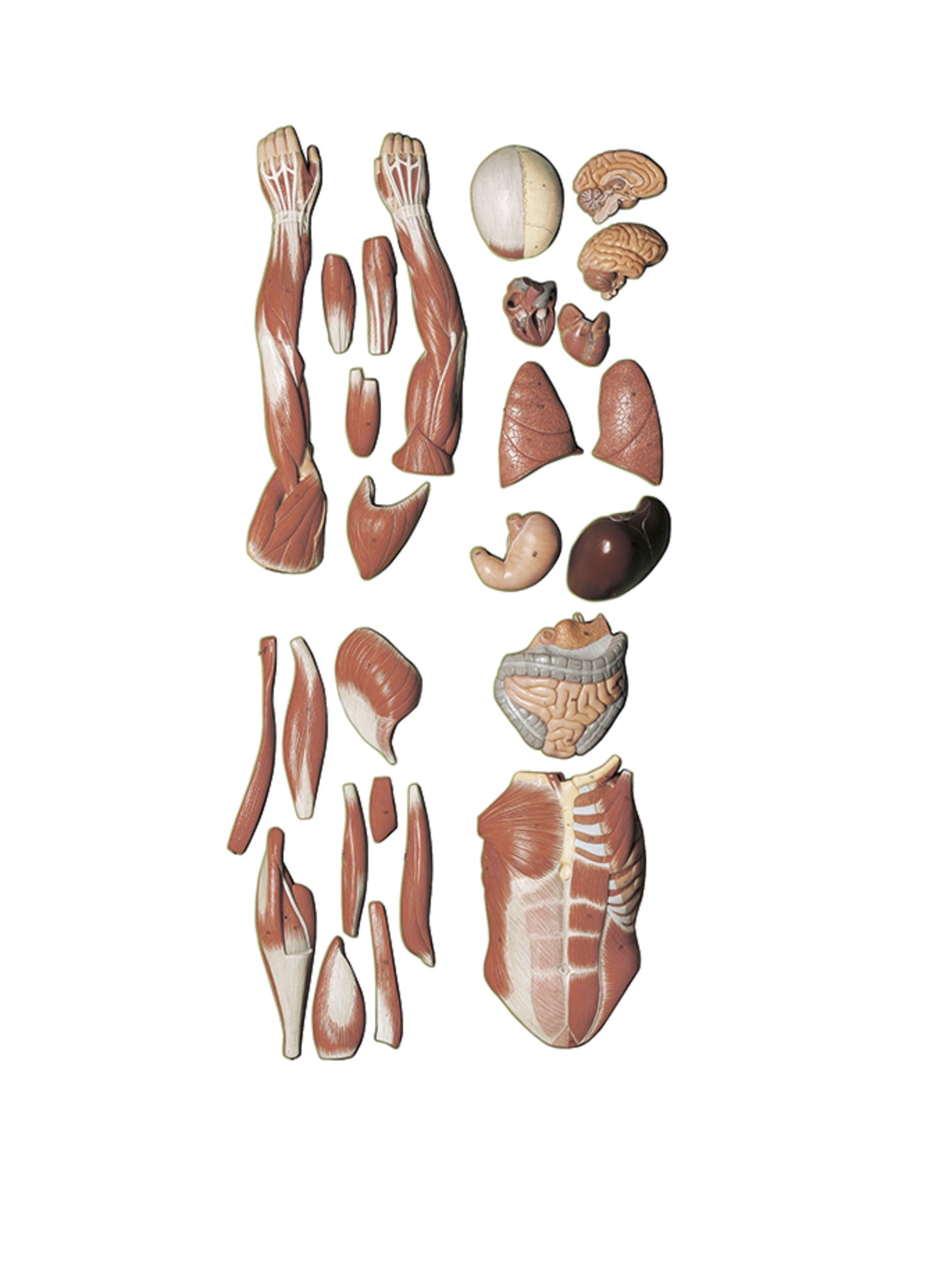 etwa 1/2 natürlicher Größe, aus SOMSO-Plast®. Insgesamt in 27 Teile zerlegbar: Schädeldach, Gehirn (2), Brust- und Bauchwand, Lungenhälften (2), Herz (2), Leber, Magen, Zwölffinger-, Dünn- und Dickdarm, rechter Arm, linker Arm mit vier abnehmbaren Muskeln, Beinmuskeln (9), Körper. Auf Stativ mit grünem Sockel. Höhe Figur 82 cm.